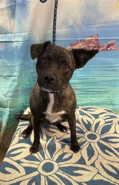 The shelter named me Wiggles. I am a 2 year old female brown brindle & white Terrier Mix. I have been at the shelter since Friday, July 25, 2025. Must provide proof of home ownership or landlord approval at the time of adoption.